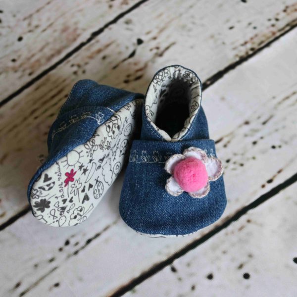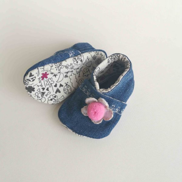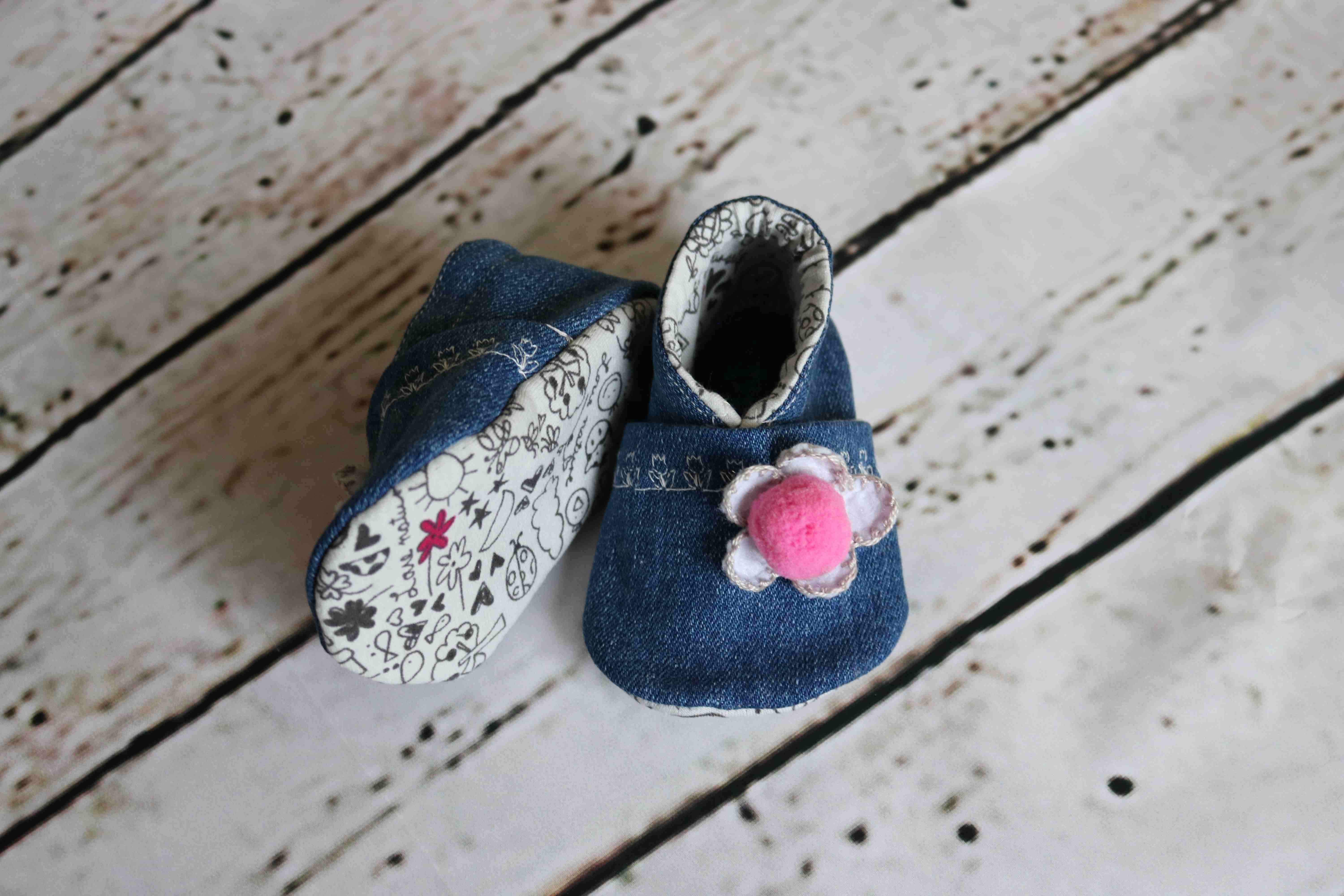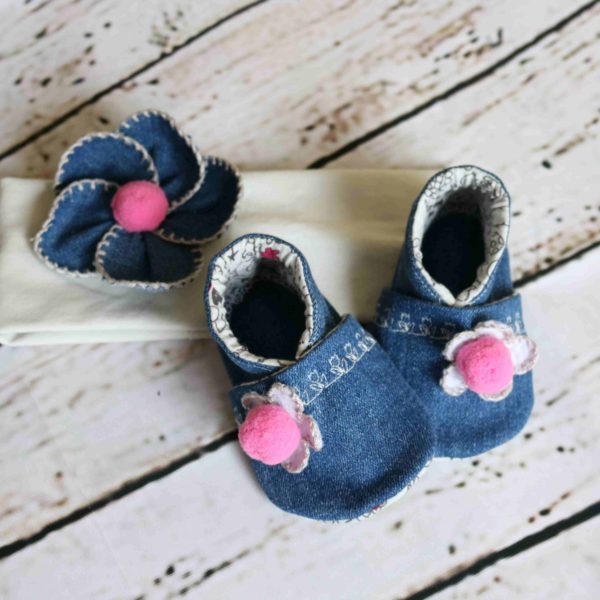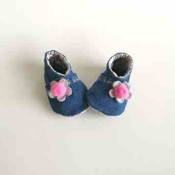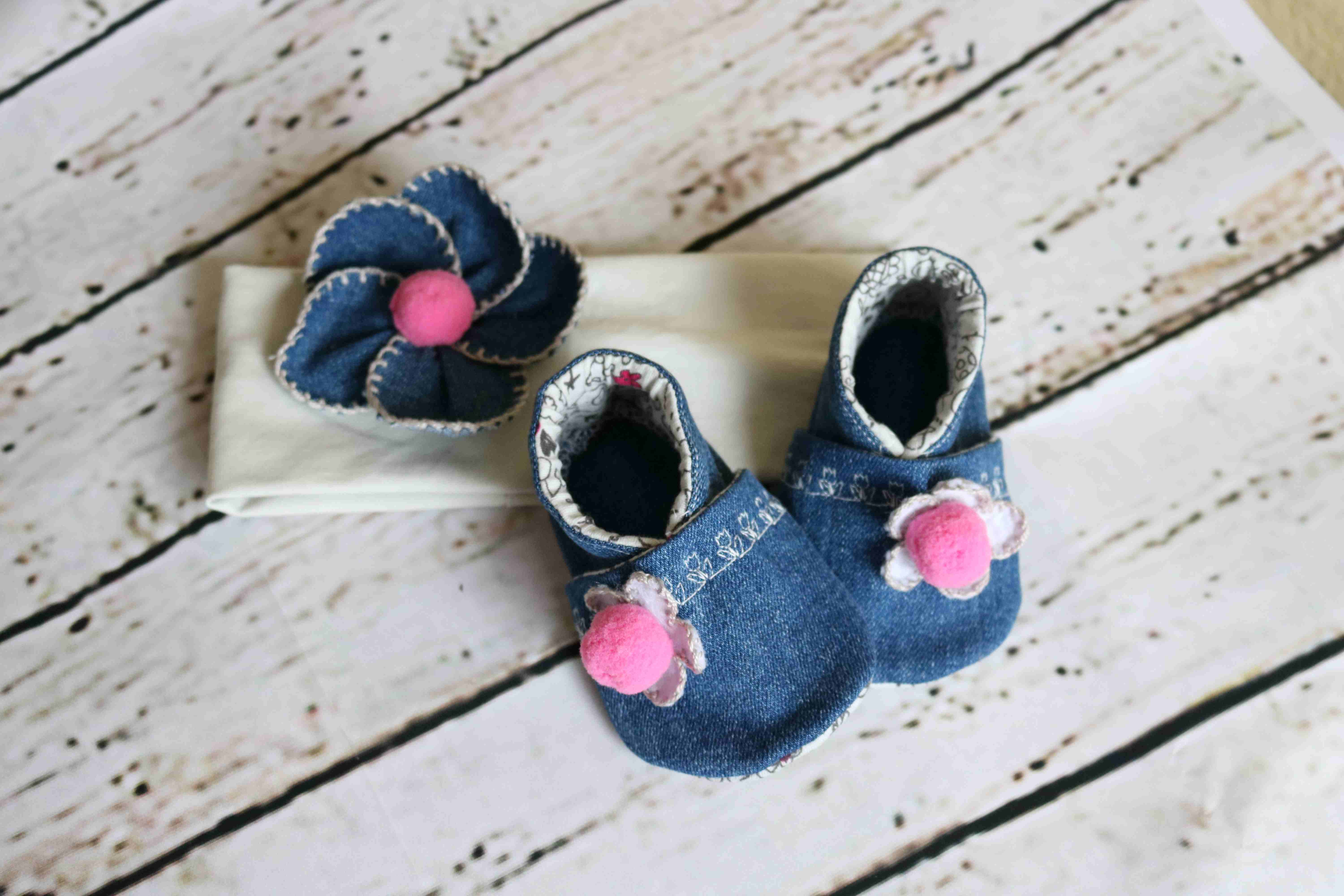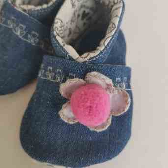 Unikatni otroški copatki iz jeansa ,podloženi z mehkim prožnim bombažem in ročno izdelano cvetlico.