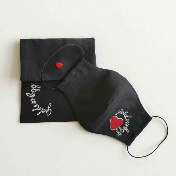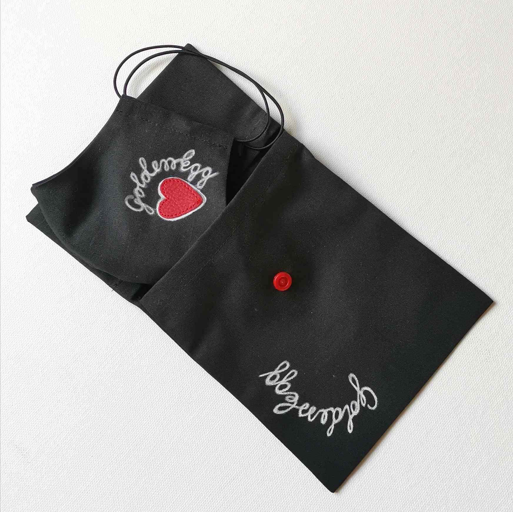 Obrazna maska z ročno izdelano aplikacijo in torbico za shranjevanje.