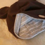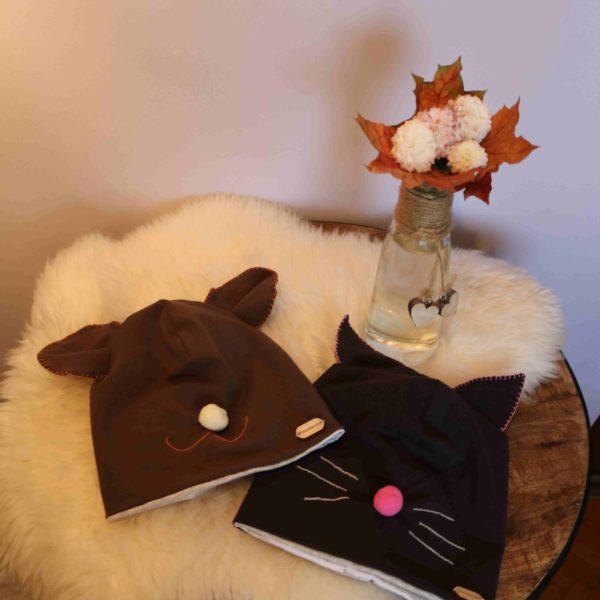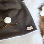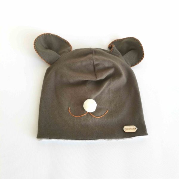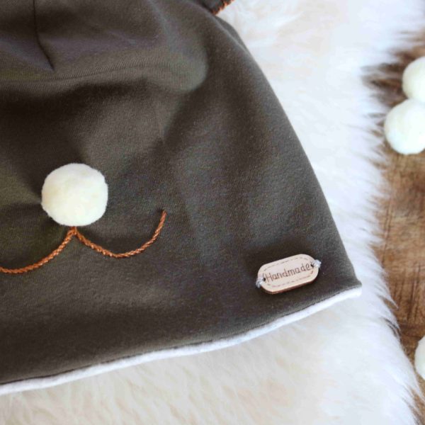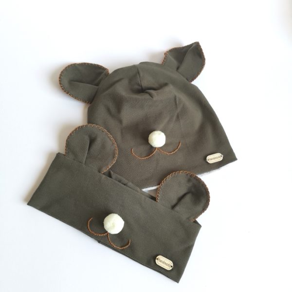 Unikatna kapica z ušeski v videzu medvedka je sešita iz mehkega bombaža. Kapa je dvoplastna, zunanja stran je v olivno zeleni barvi, notranja pa v svetlo sivi barvi – črtast vzorec.