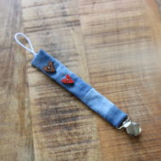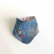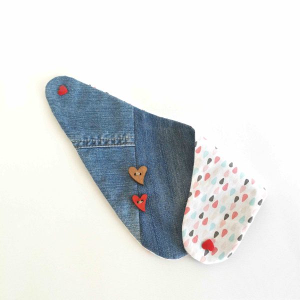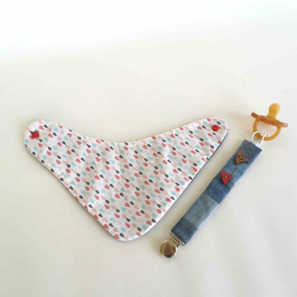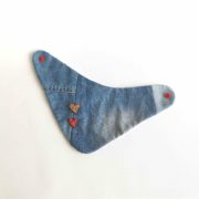 Otroška ovratna rutka iz jeansa v kompletku  s tracvem za dudko  in lesenimi srčki.