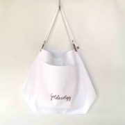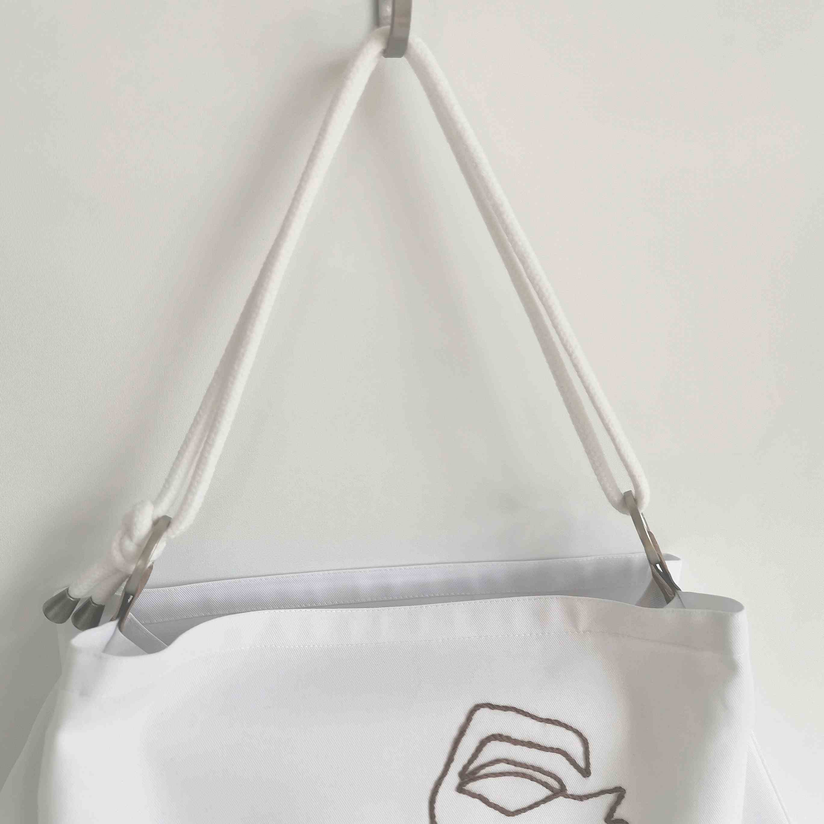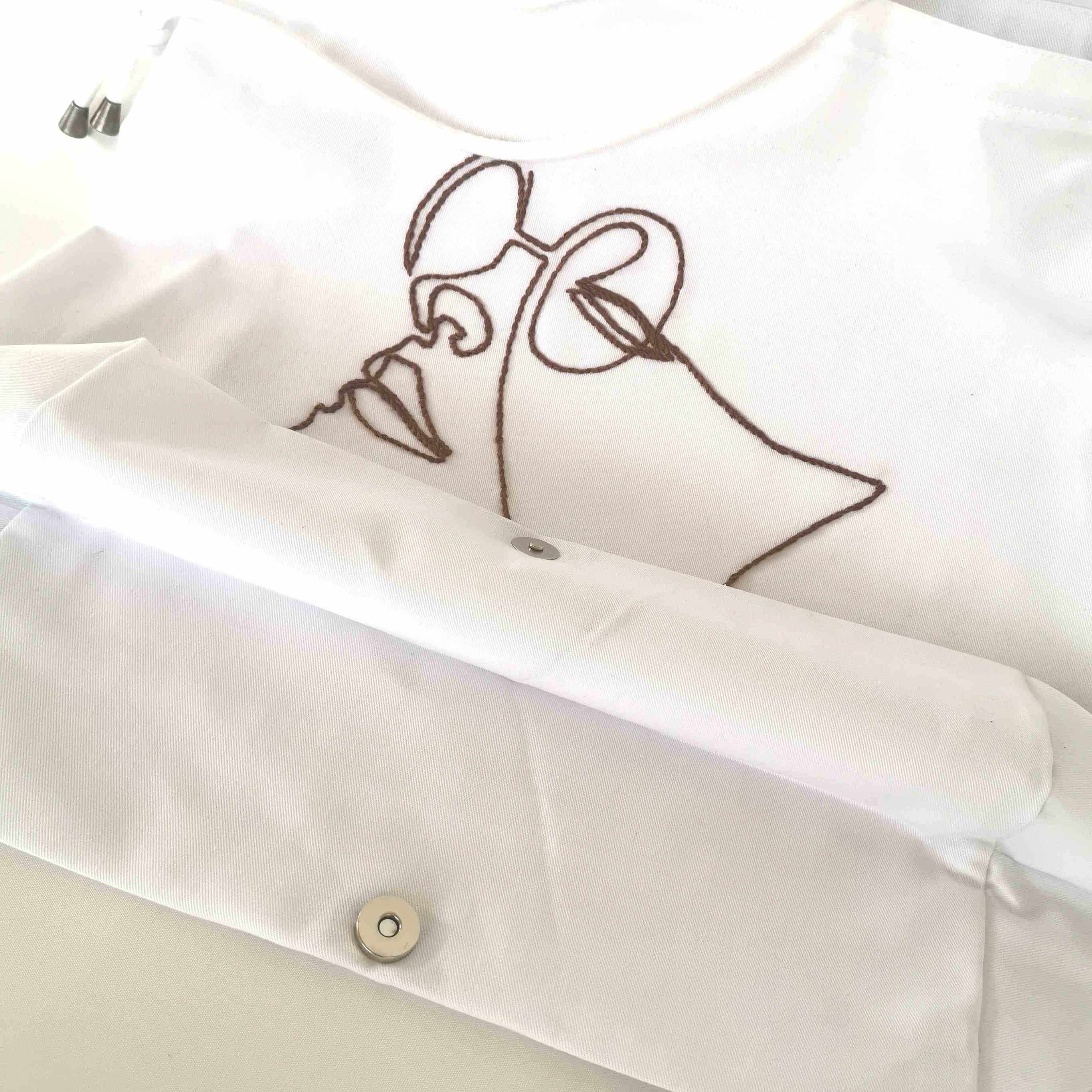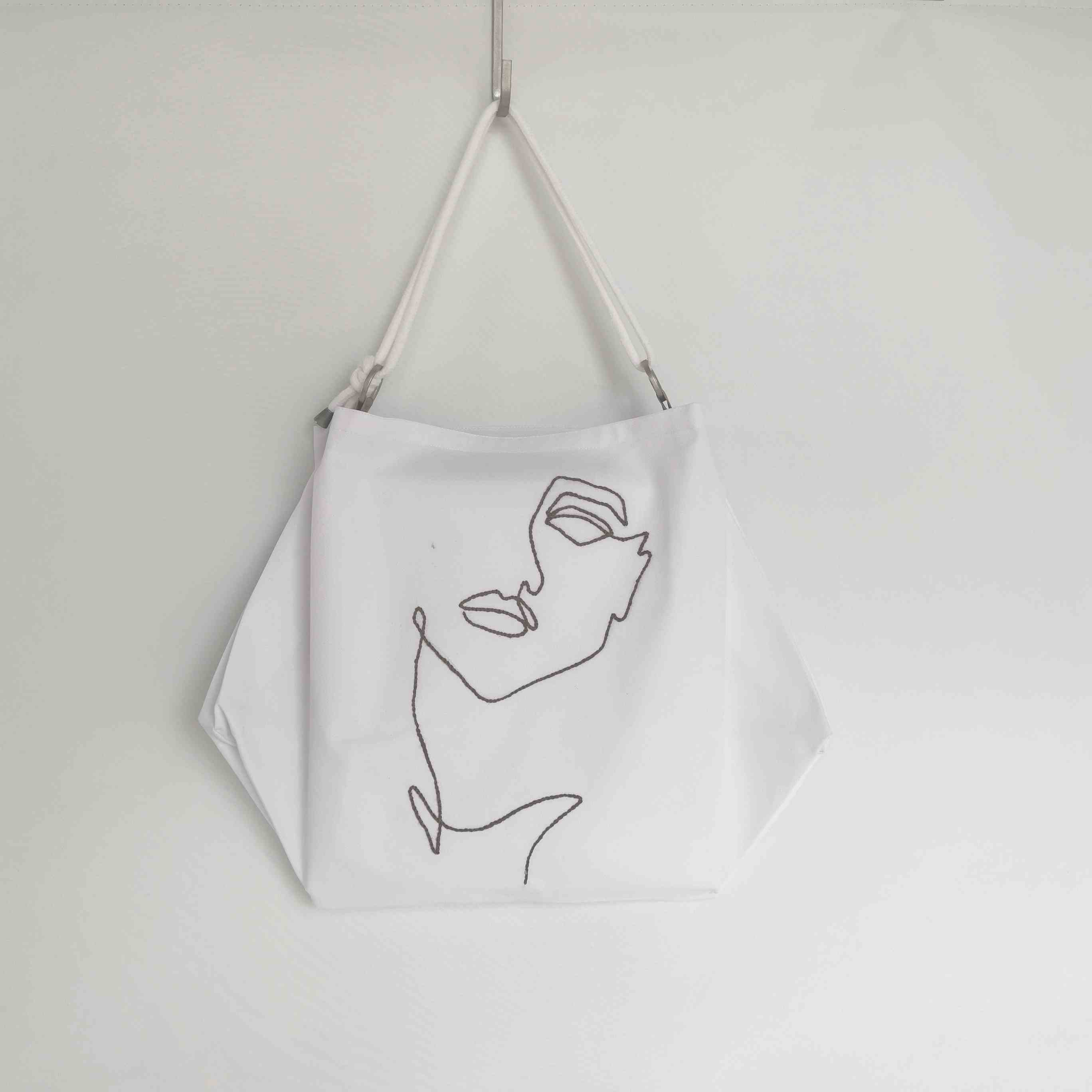 Unikatna lahka prostorna torba z ročno vezeno enopotezno aplikacijo spredaj in velikim žepom na zadnji strani.