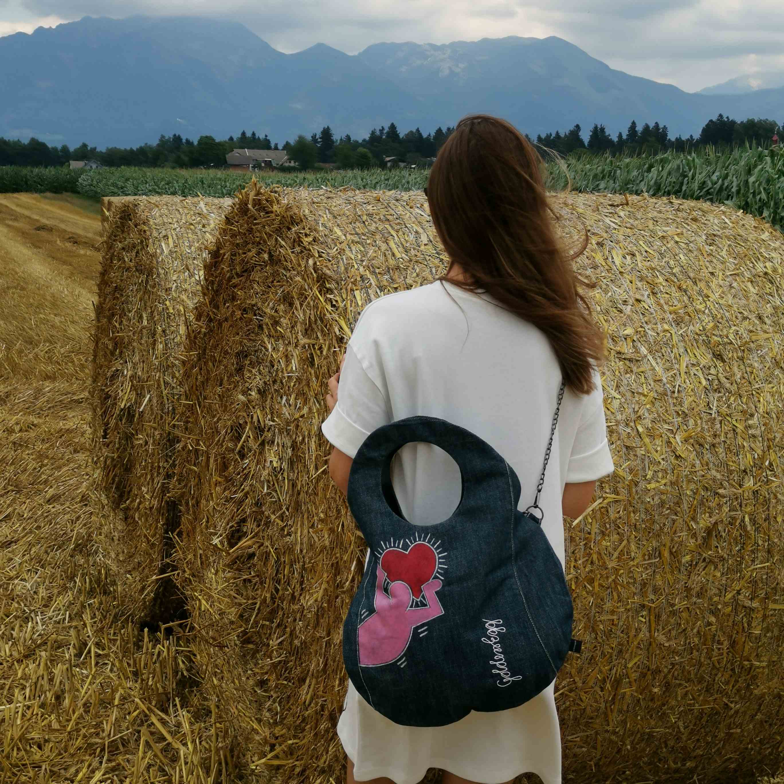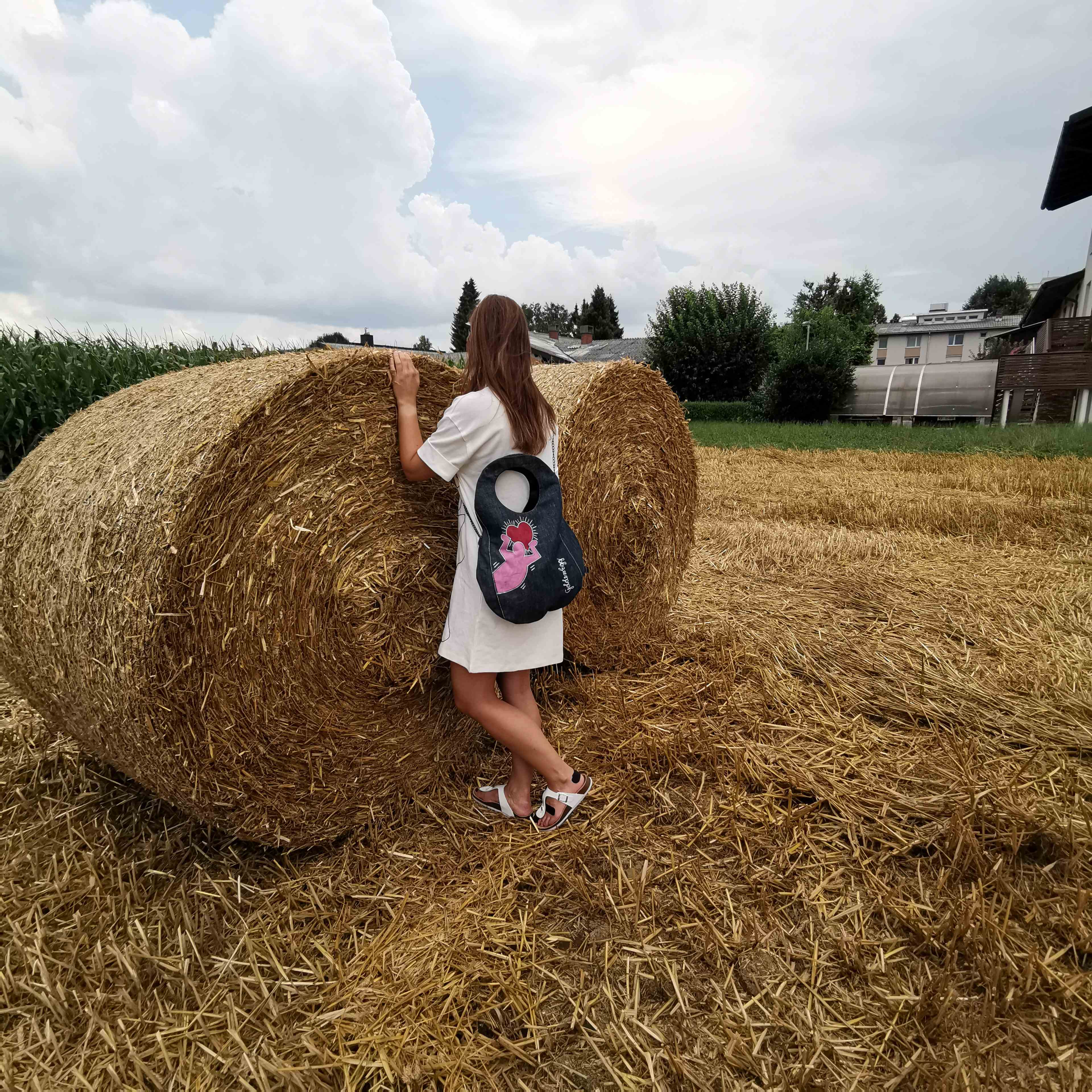 Unikatna jeans torbica z ročno poslikavo na prednji in zadnji strani, za piko na i.