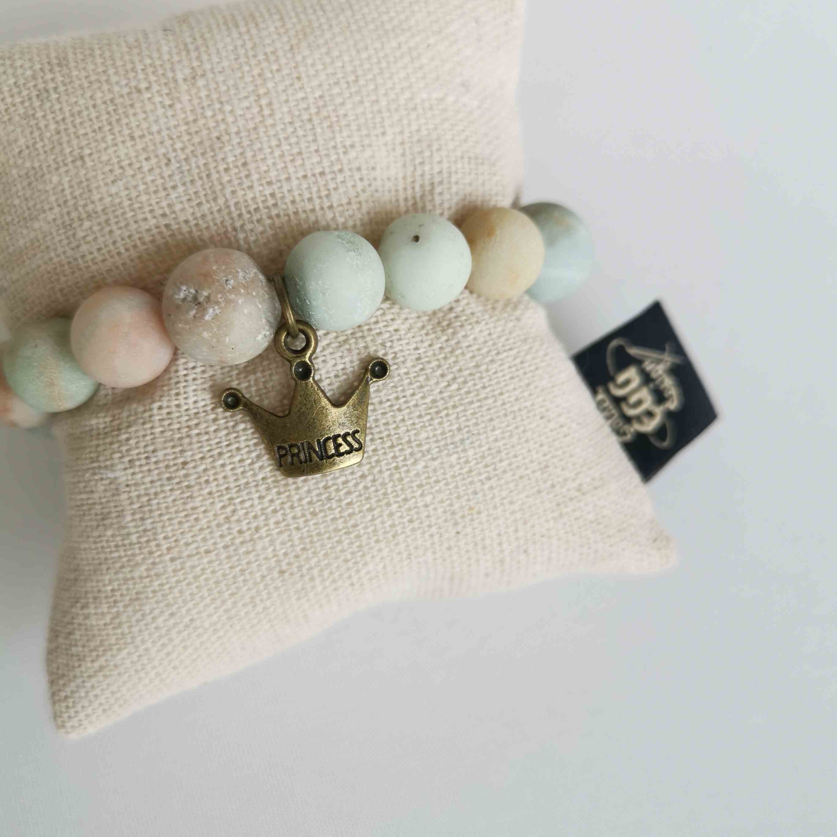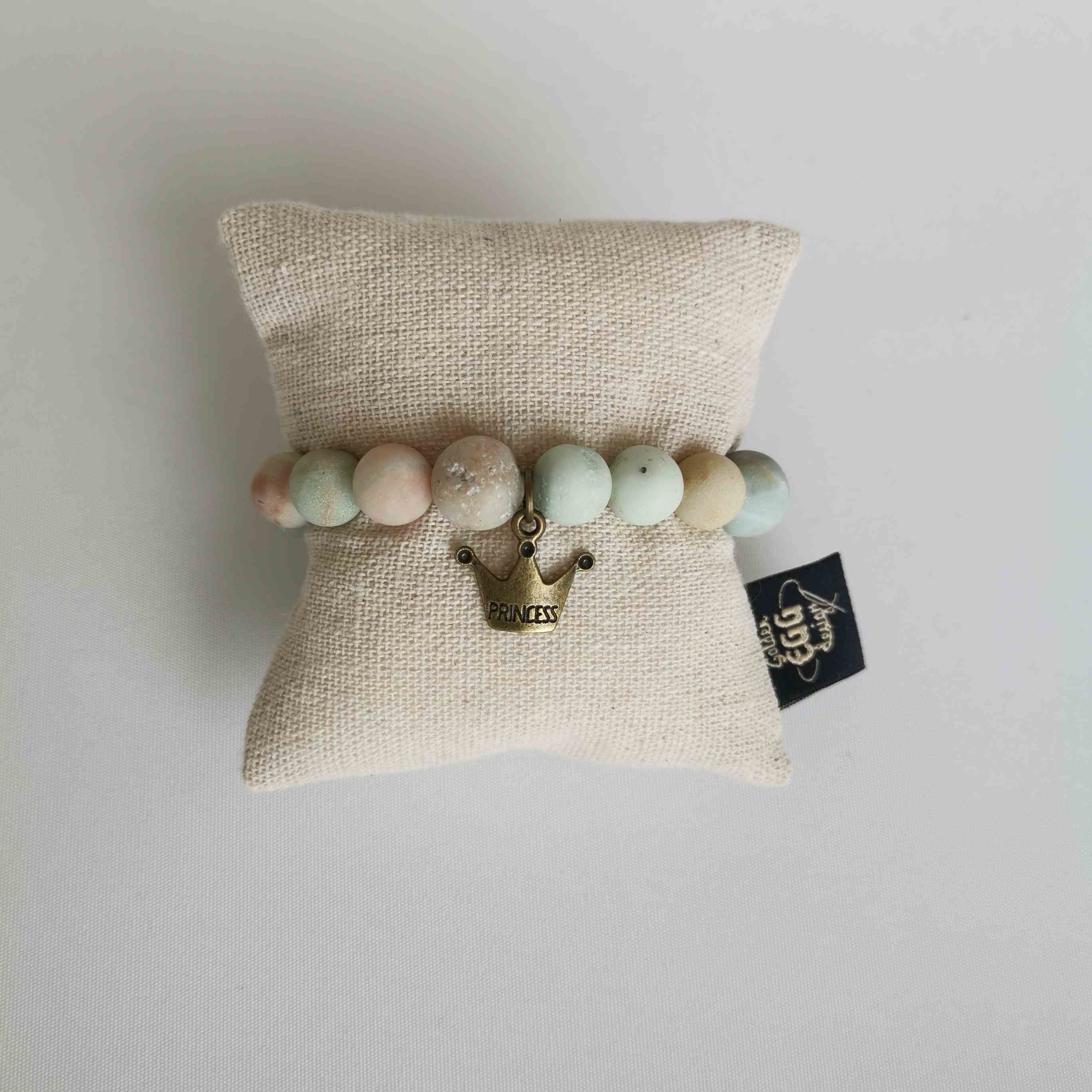 Zapestnica iz naravnih kamnov v nevtralnih barvah s prikupnim obeskom.