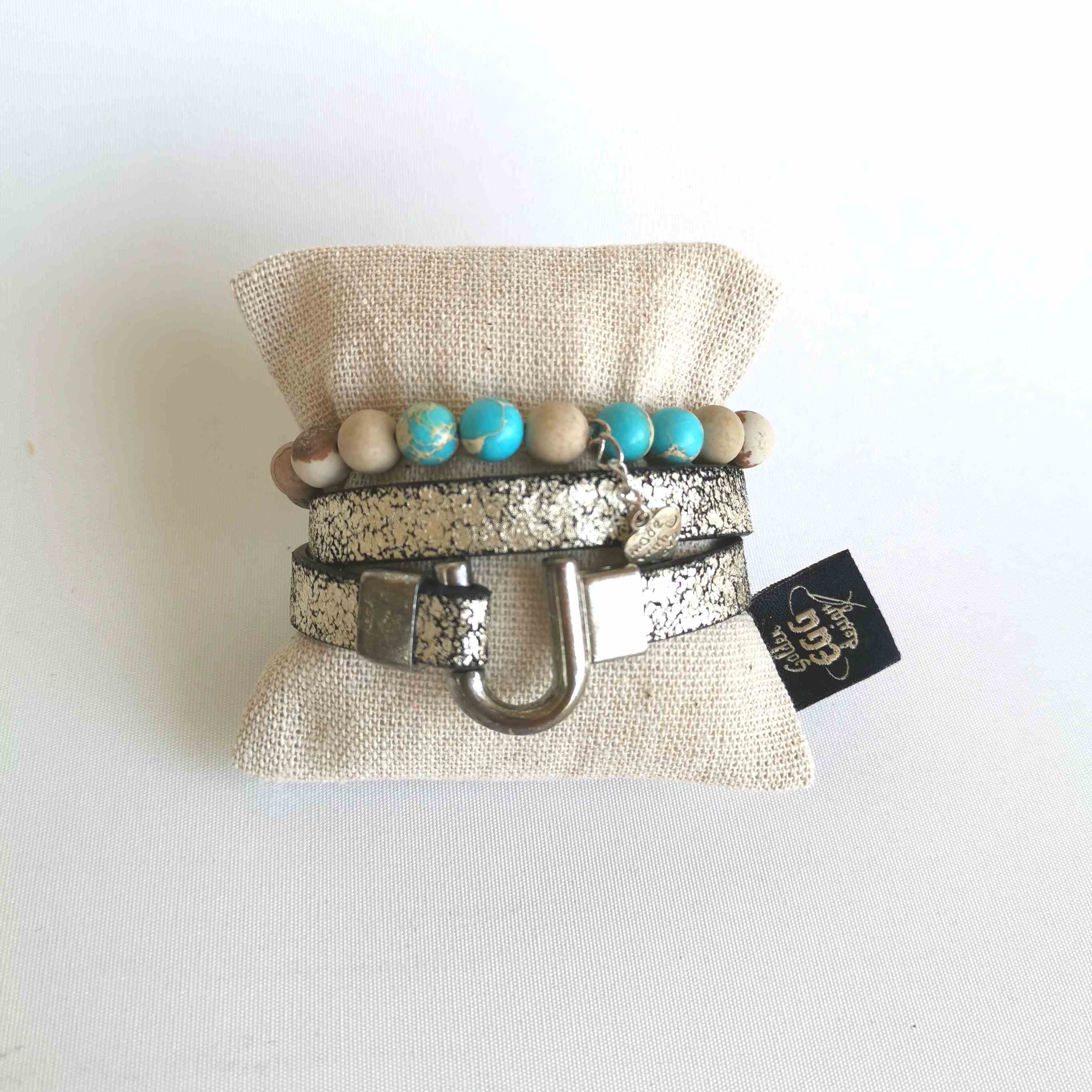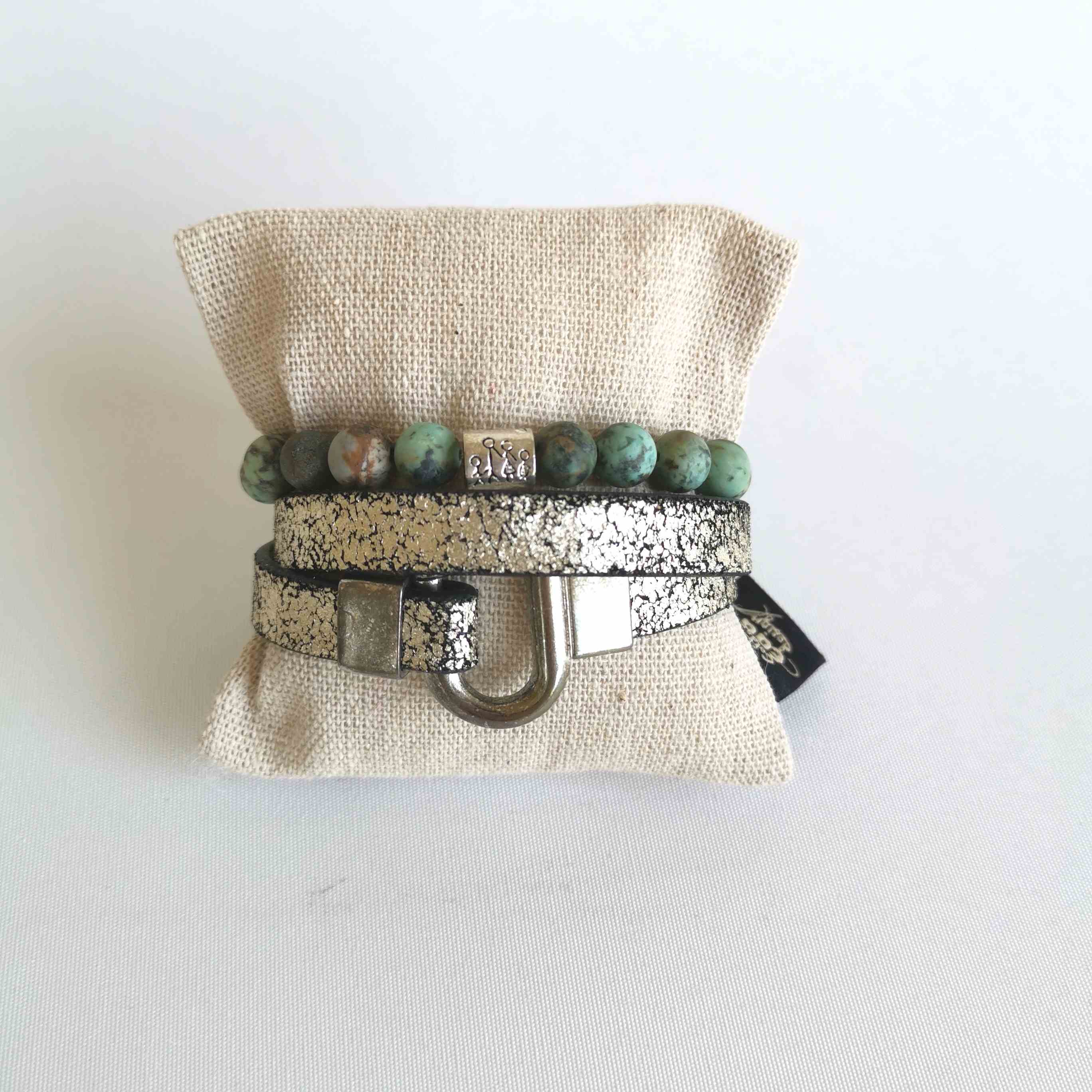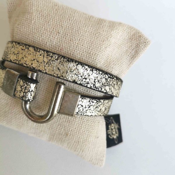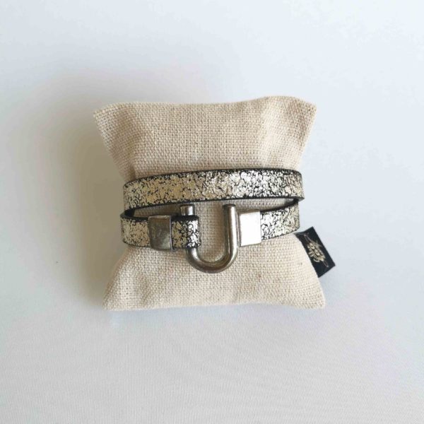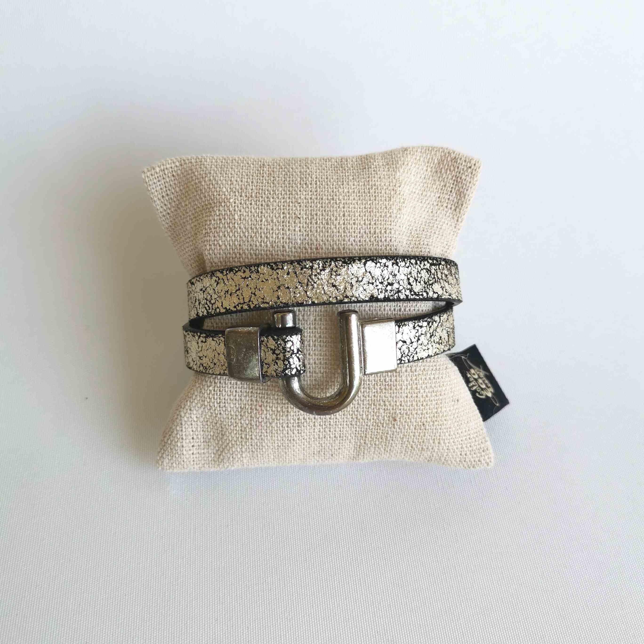 Usnjena zapestnica zlato srebrnega leska obrabljenega videza v dvojnem ovitju z zaponko.